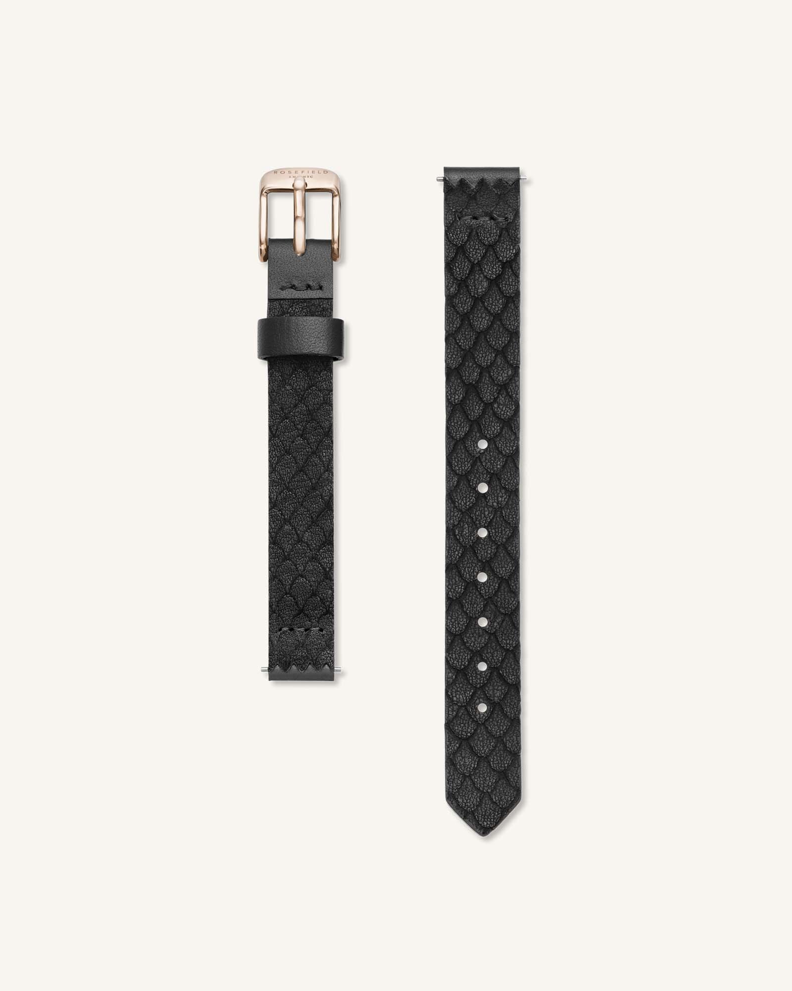 Zwarte, ongestikt leren horlogeband met patroon.