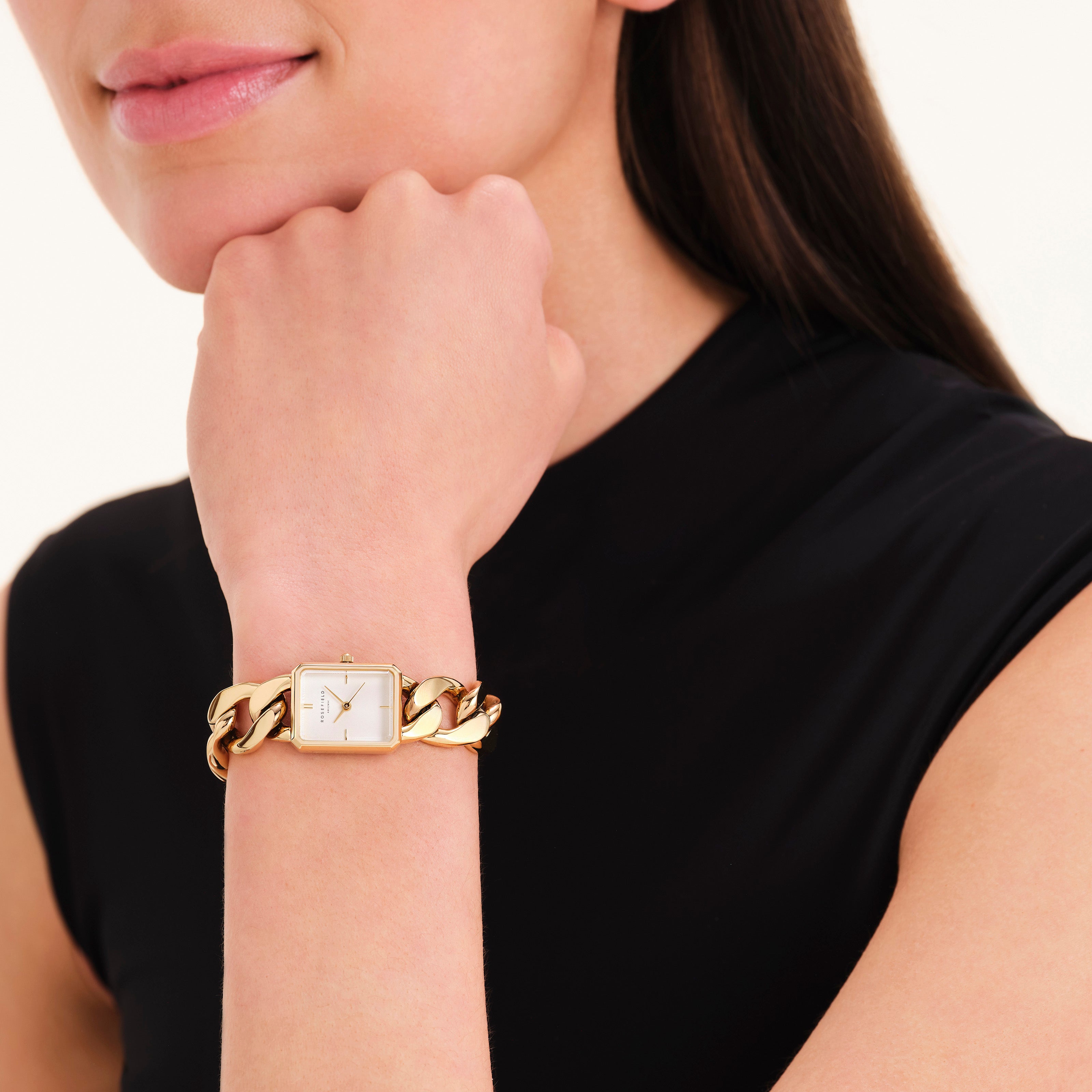 Ontdek Rosefield Studio: een collectie van uitgesproken items met een extra premium uitstraling. Het nieuwste RF Studio item is een twist op het klassieke Octagon horloge, maar dan in een kleiner XS formaat. De horlogeband, een luxe gepolijste platte kinketting, maakt van dit klokje bijna een sieraad. Je kunt het formaat van de ketting aanpassen om hem passend te maken en hem sluiten door de T-bar door de O-ring te vergrendelen.